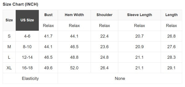 Size chart shown under images