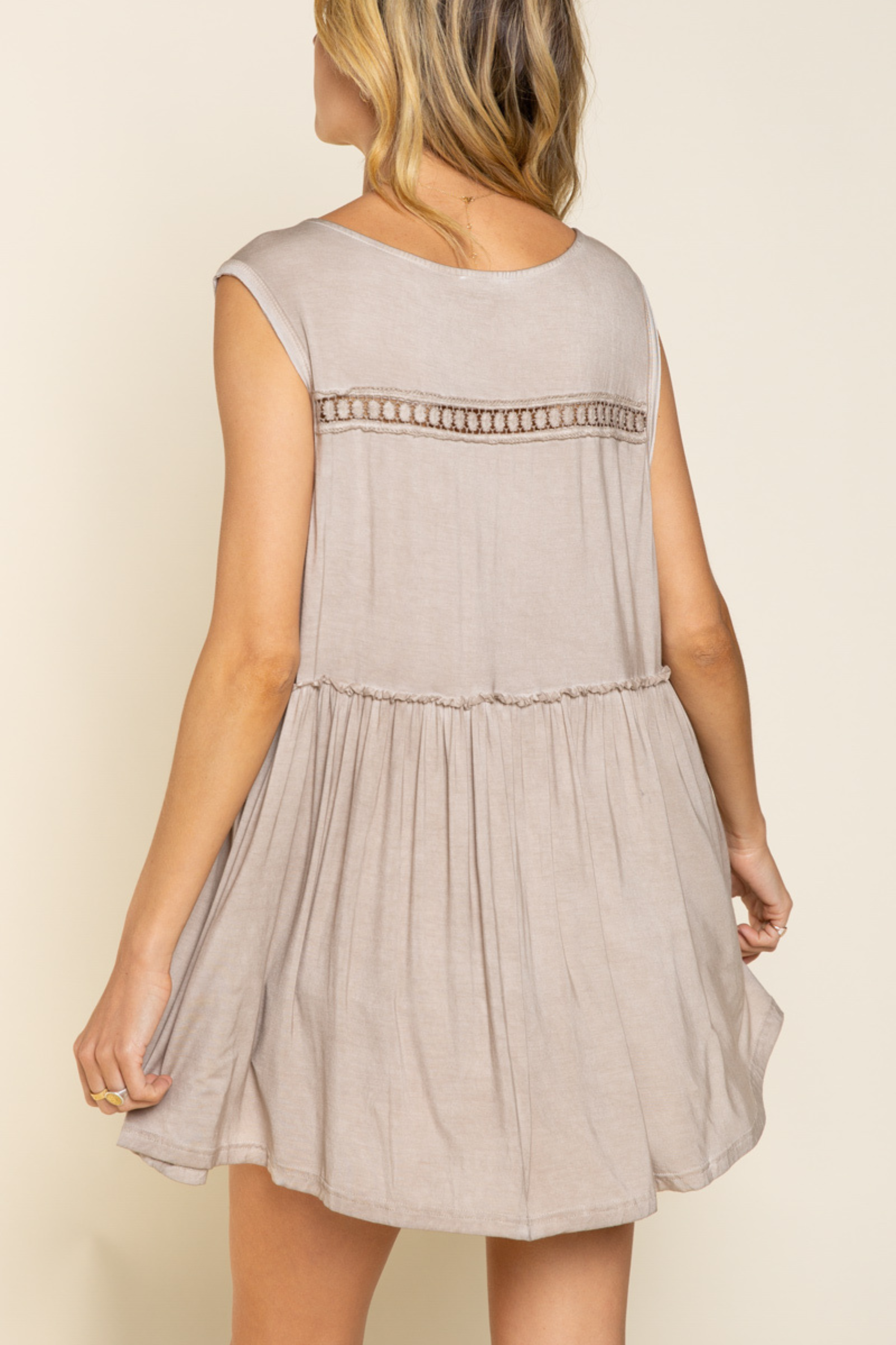 Designed in a relaxed baby doll fit with low V neckline, sleeveless, layers of see-through lace trim detailing on the bust and back yoke, baby ruffle detailing on the bust with raw edge and finished with flowy bottom with clean hem.