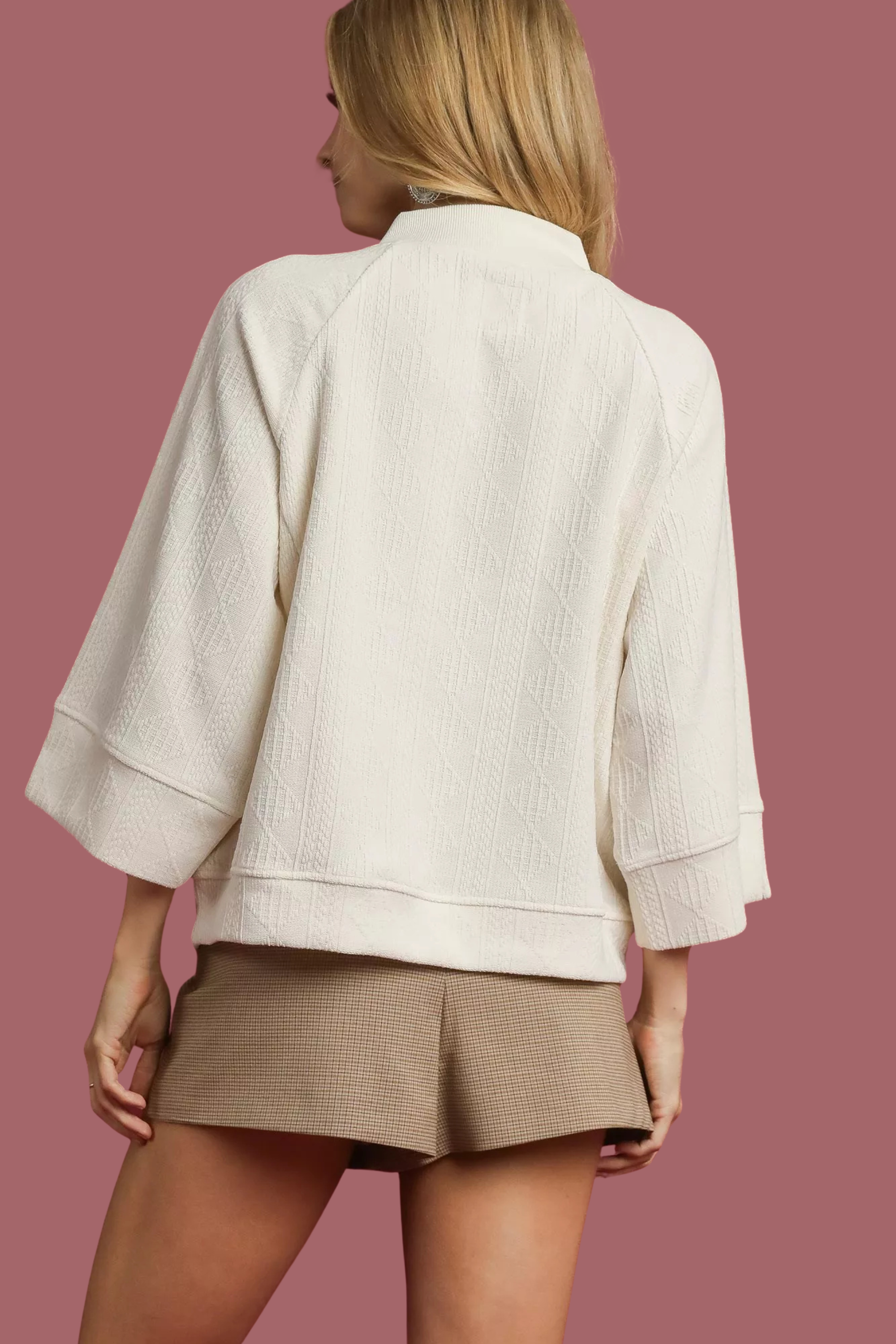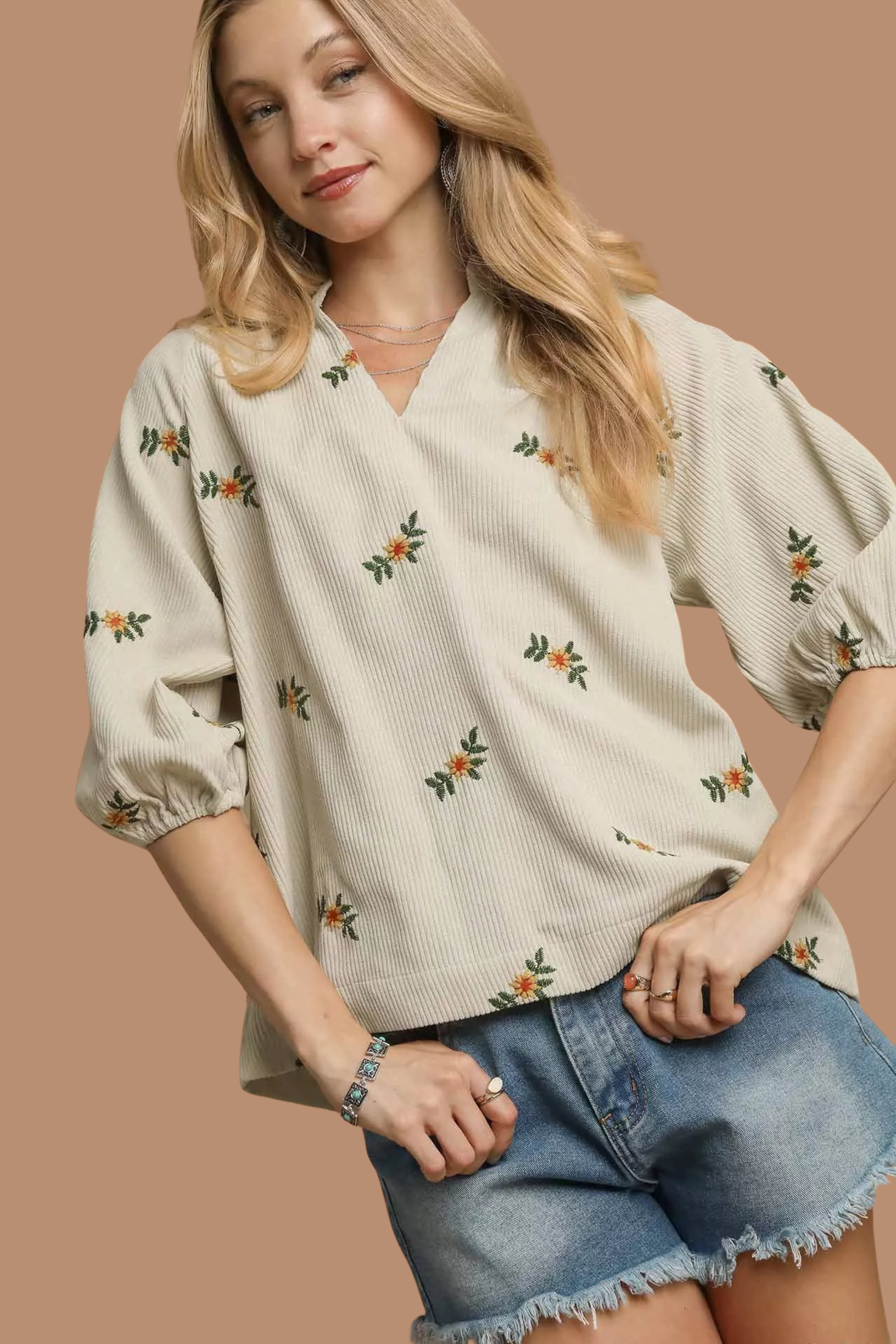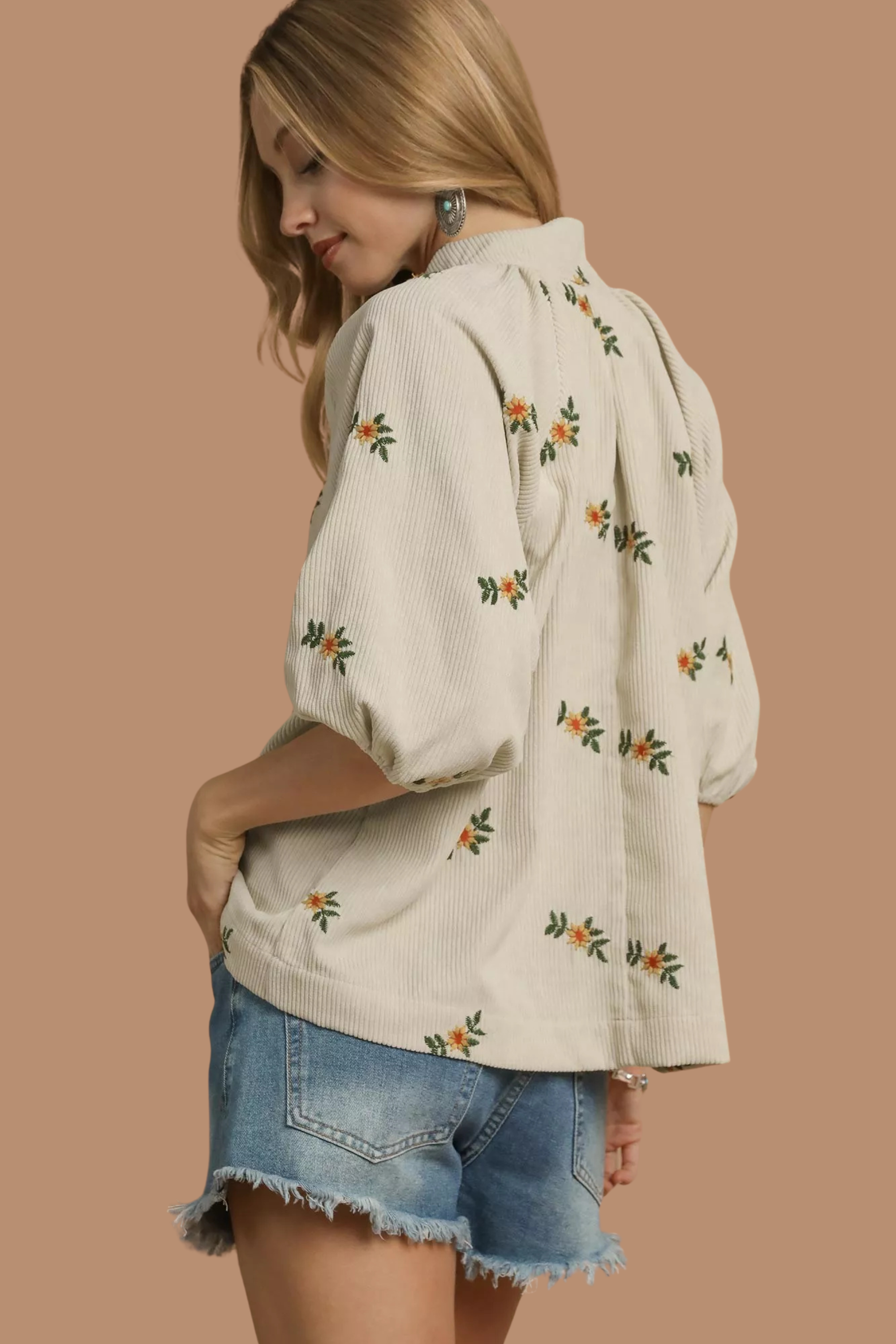 Corduroy Floral Embroidered Puff Sleeve Blouse