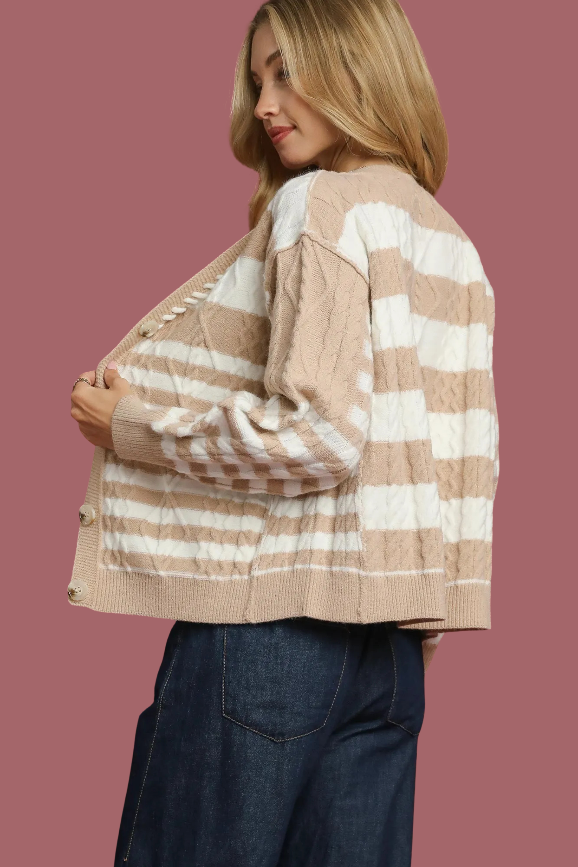 Stay cozy and stylish in this striped button-up cardigan. The cable-knit design adds texture and warmth to this classic piece. The stripe pattern gives a modern and chic twist to the traditional cardigan style. Perfect for layering over a blouse or dress for a fashionable look.