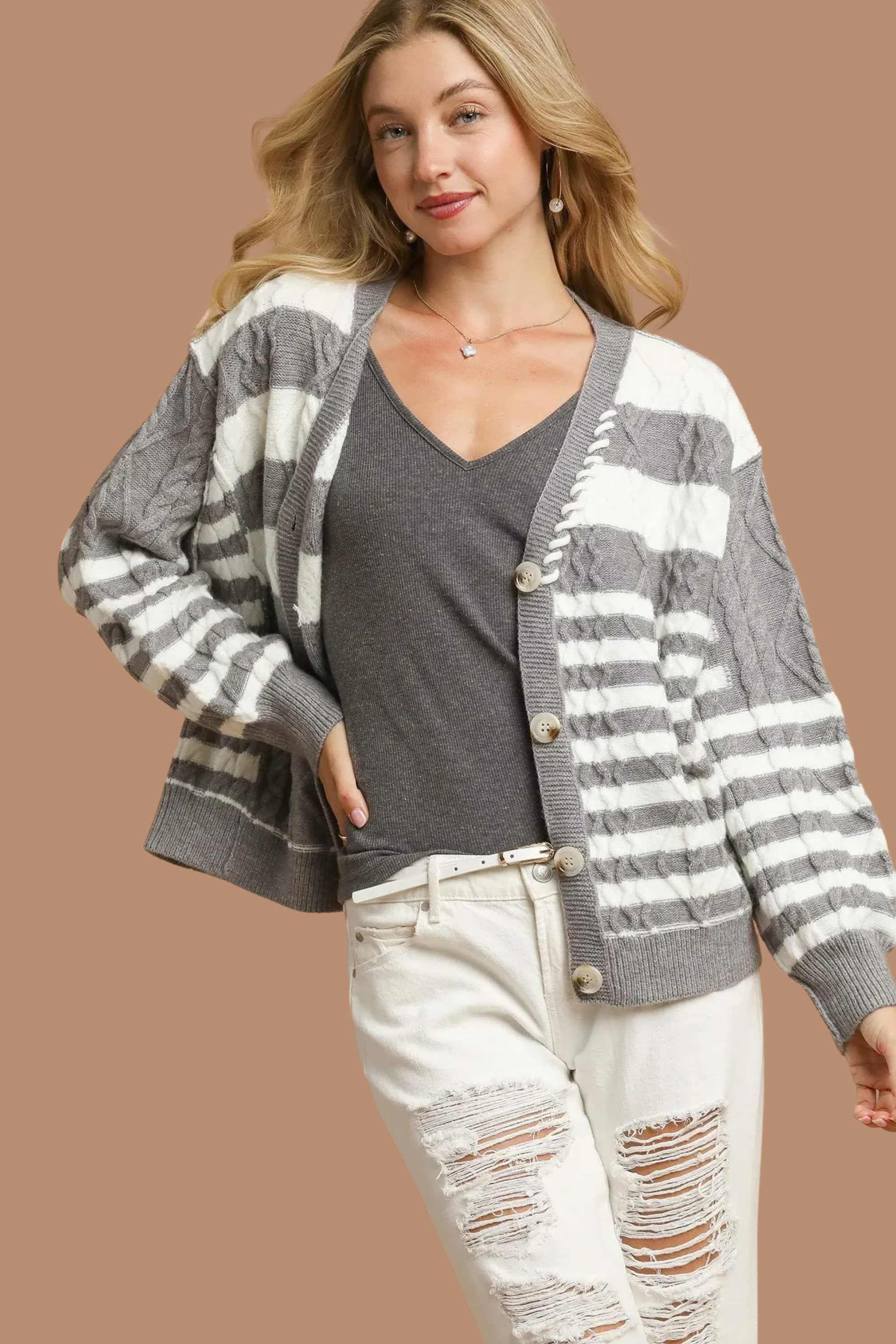 Stay cozy and stylish in this striped button-up cardigan. The cable-knit design adds texture and warmth to this classic piece. The stripe pattern gives a modern and chic twist to the traditional cardigan style. Perfect for layering over a blouse or dress for a fashionable look.