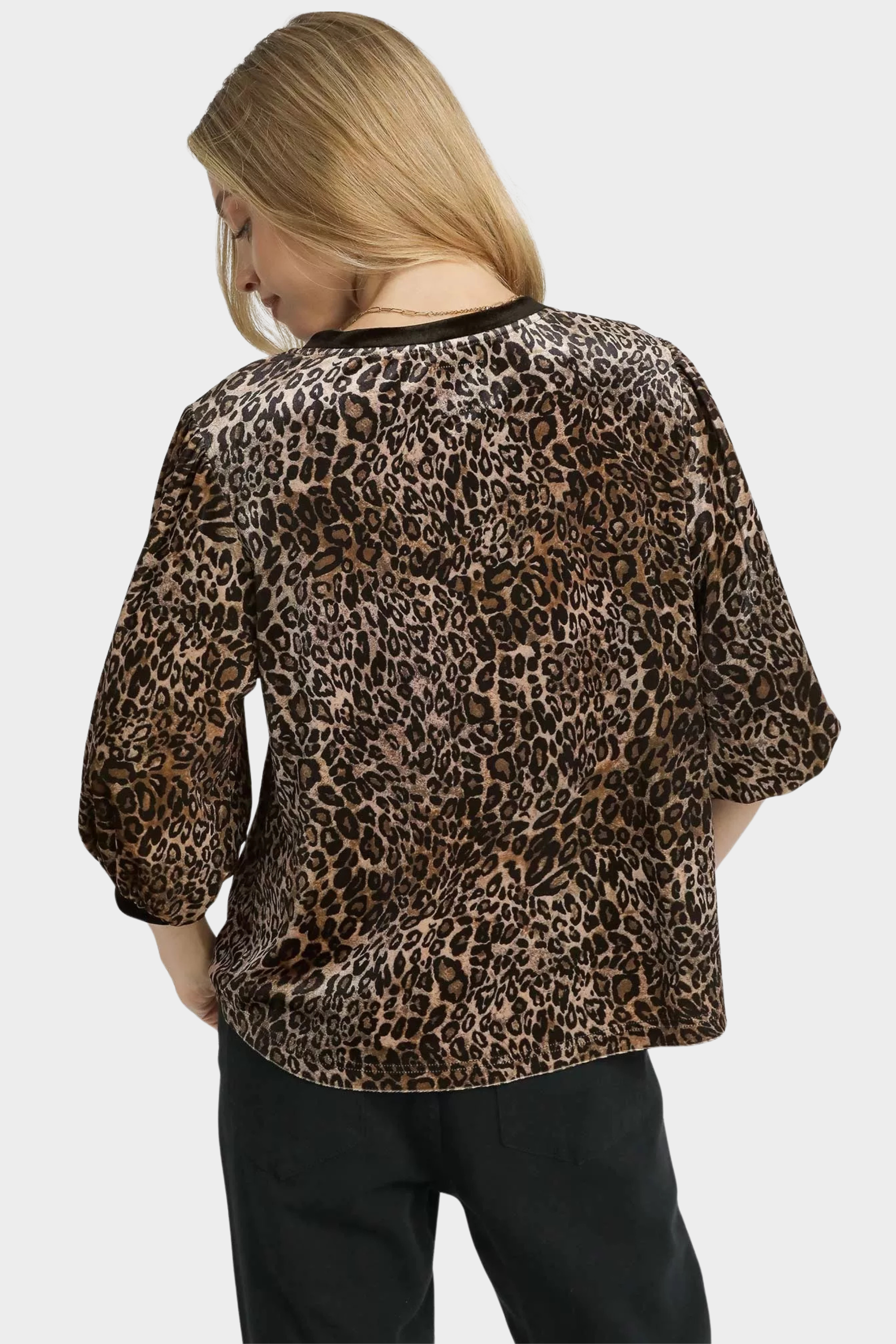 Half Button Blouse with Leopard Print Trim