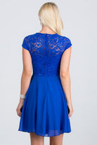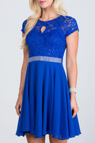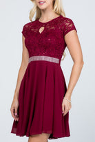 Make your glam girl dreams a reality with this beautiful lace bodice chiffon mini dress featuring a stunning beaded belt and trendy cap sleeves.
