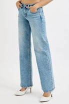 These light wash wide leg flare jeans feature a classic low-rise design with a comfortable fit through the hips and thighs, flowing into a beautiful wide leg silhouette. Crafted from premium denim fabric with a soft light blue wash, these jeans offer both style and comfort. The vintage-inspired design includes traditional five-pocket styling with contrast stitching details. Perfect for creating effortless casual looks, these jeans can be dressed up or down for various occasions. The flare leg design elongates the silhouette while the high-rise waist provides a flattering fit. Made with quality denim material that maintains its shape and color wash after multiple wears.
