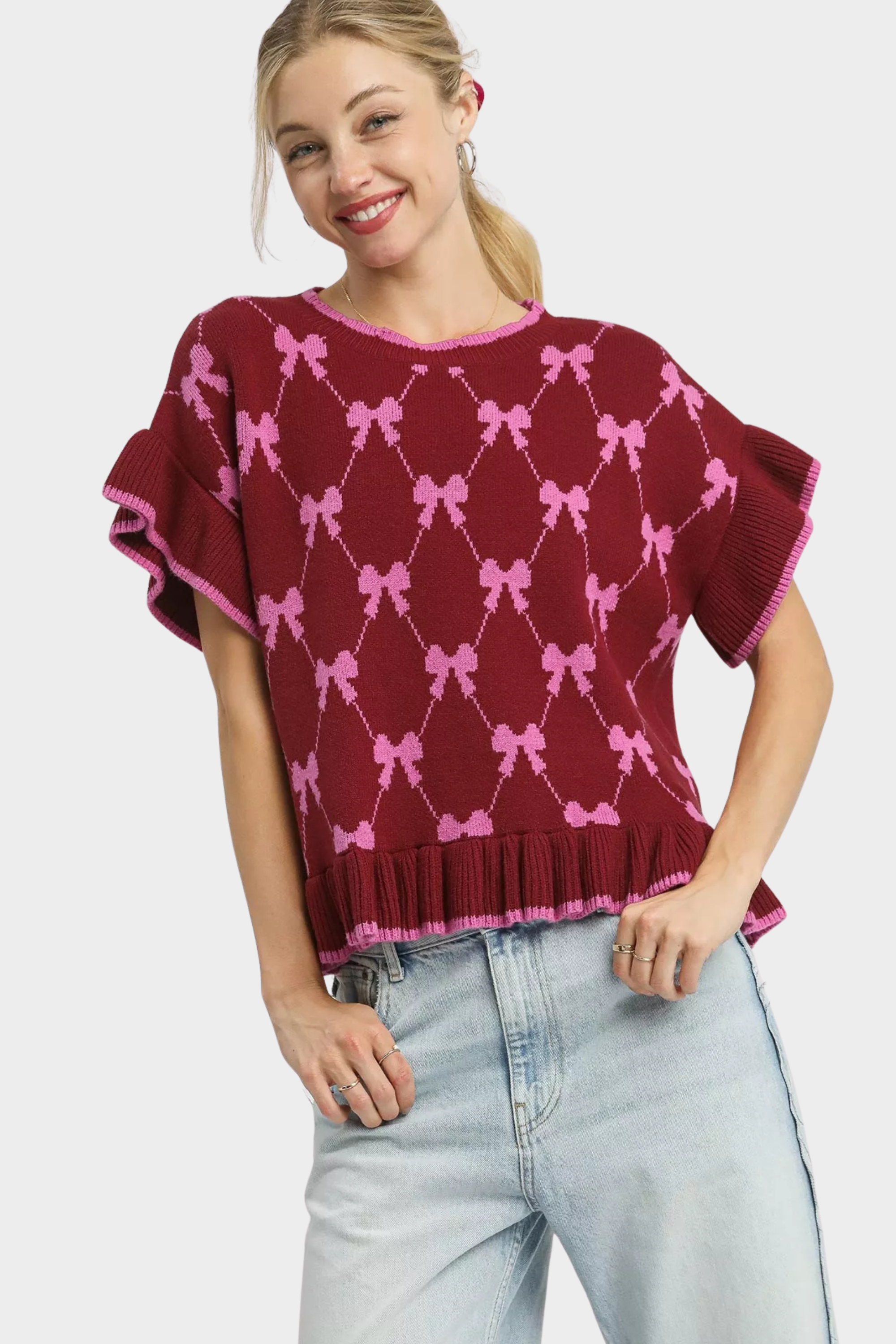 The Knit Ruffle Sleeve Sweater is a stylish choice for the colder months. The bow detail adds a playful and feminine touch to the classic knit sweater. The ruffle sleeves provide a chic and trendy look, perfect for adding a statement to your outfit. Made from cozy and warm fabric, this sweater is both comfortable and fashionable. Pair with jeans or skirts for a versatile and chic ensemble.