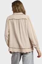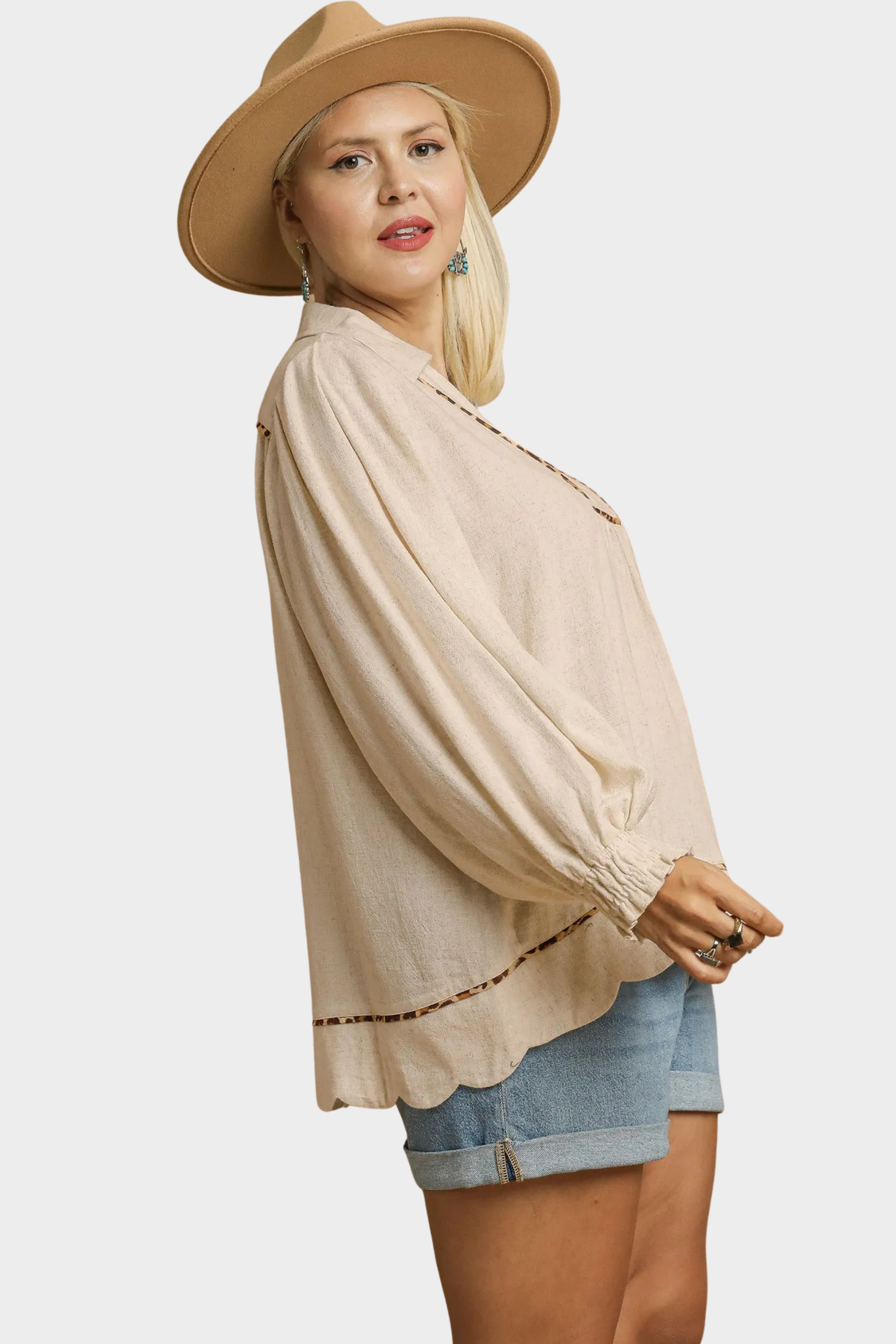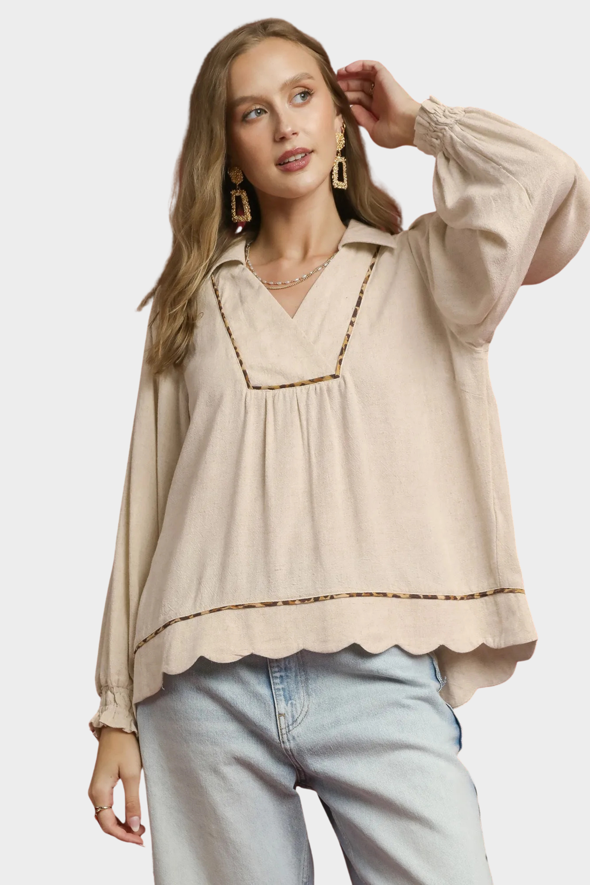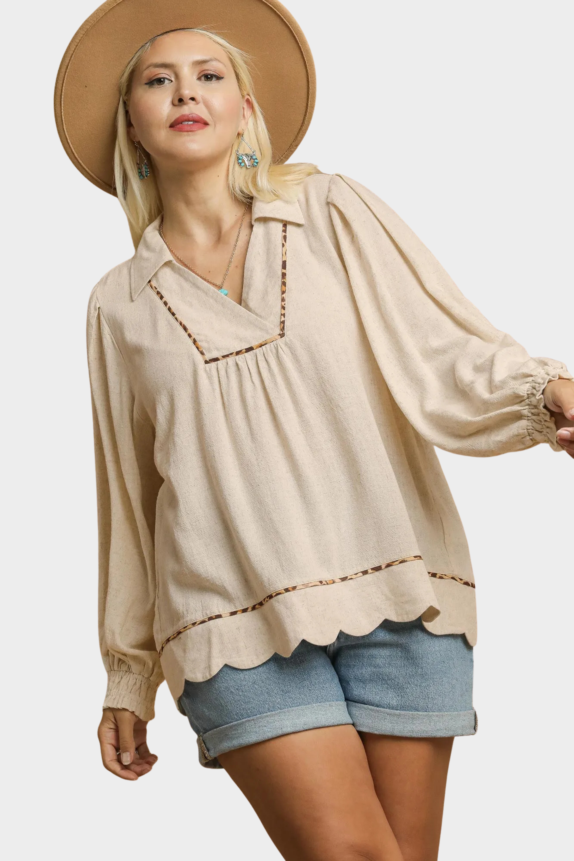 The Linen Scallop Hem Blouse is a chic addition to any wardrobe. The contrast trim adds a pop of color and detail to the classic design. Made from high-quality linen, this blouse is both comfortable and breathable. The scallop hem adds a feminine touch to the overall look. Perfect for pairing with jeans or dress pants for a versatile and fashionable outfit.