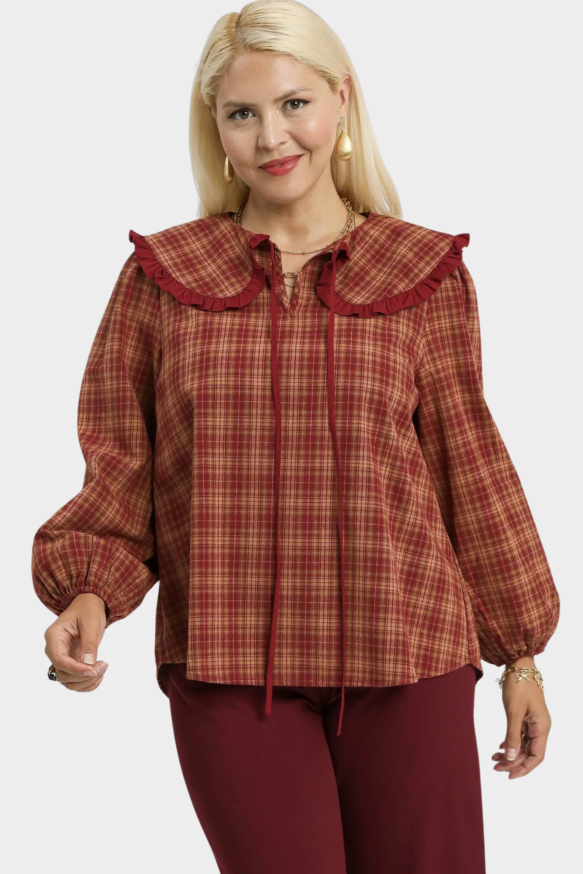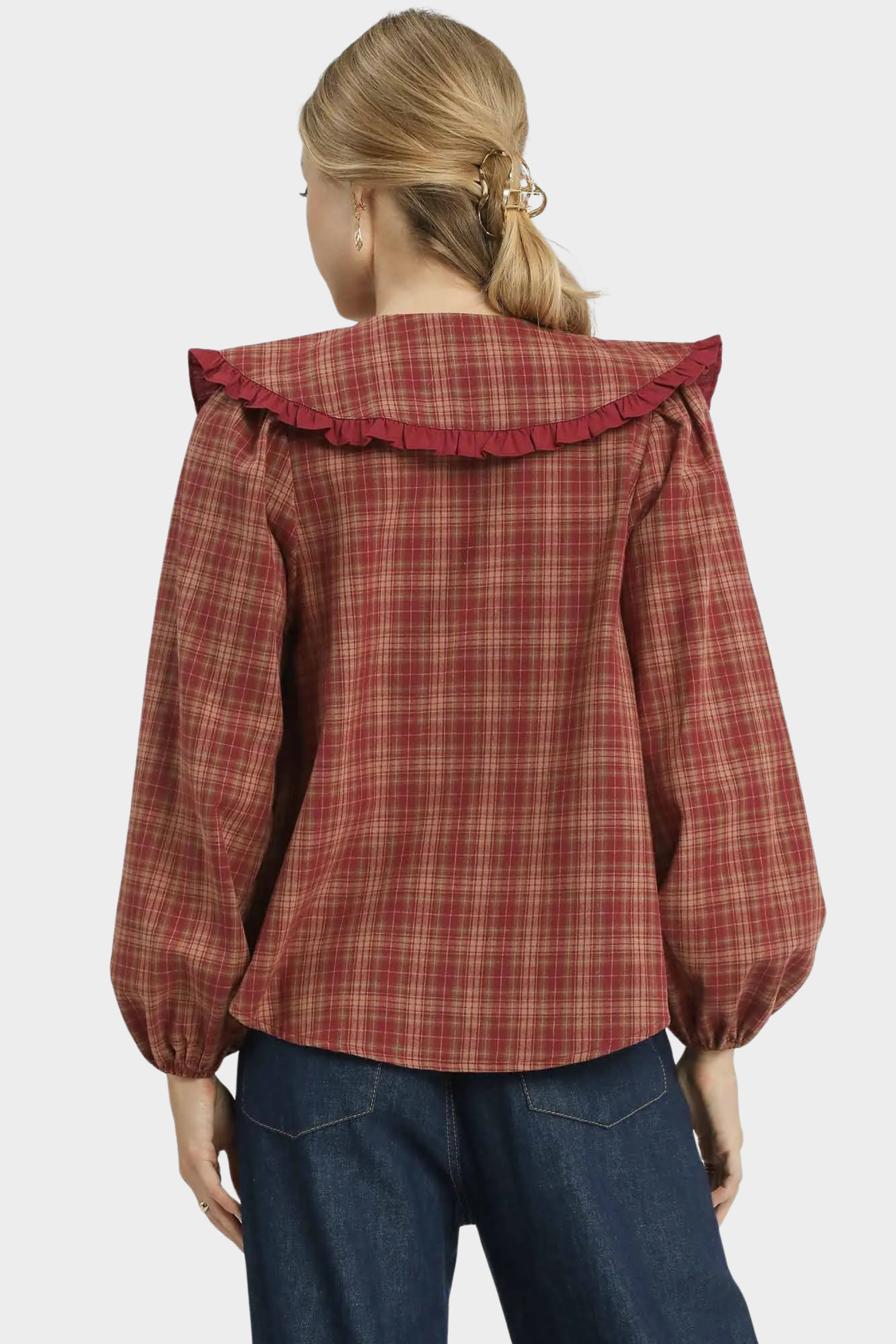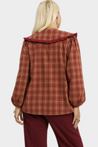 This charming green plaid blouse features a romantic ruffle collar and feminine puff sleeves that create a vintage-inspired silhouette. Made from soft cotton blend fabric, it offers comfortable all-day wear with its relaxed fit design. The classic button-up front and elastic sleeve cuffs provide both style and functionality. Perfect for casual outings, weekend brunches, or layering in cooler weather. The timeless plaid pattern adds a preppy touch while the ruffle details bring feminine charm. Machine washable for easy care and maintenance.