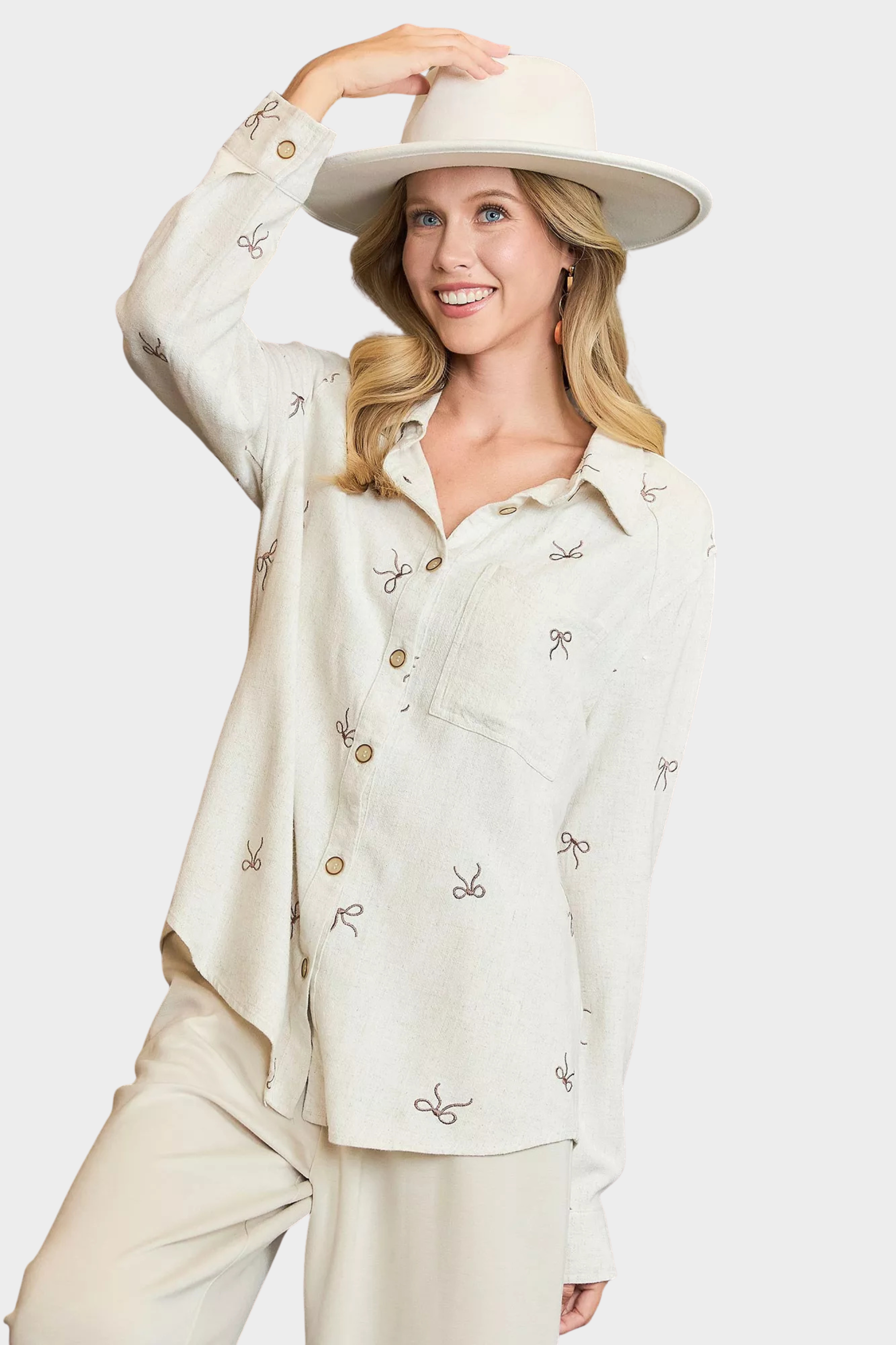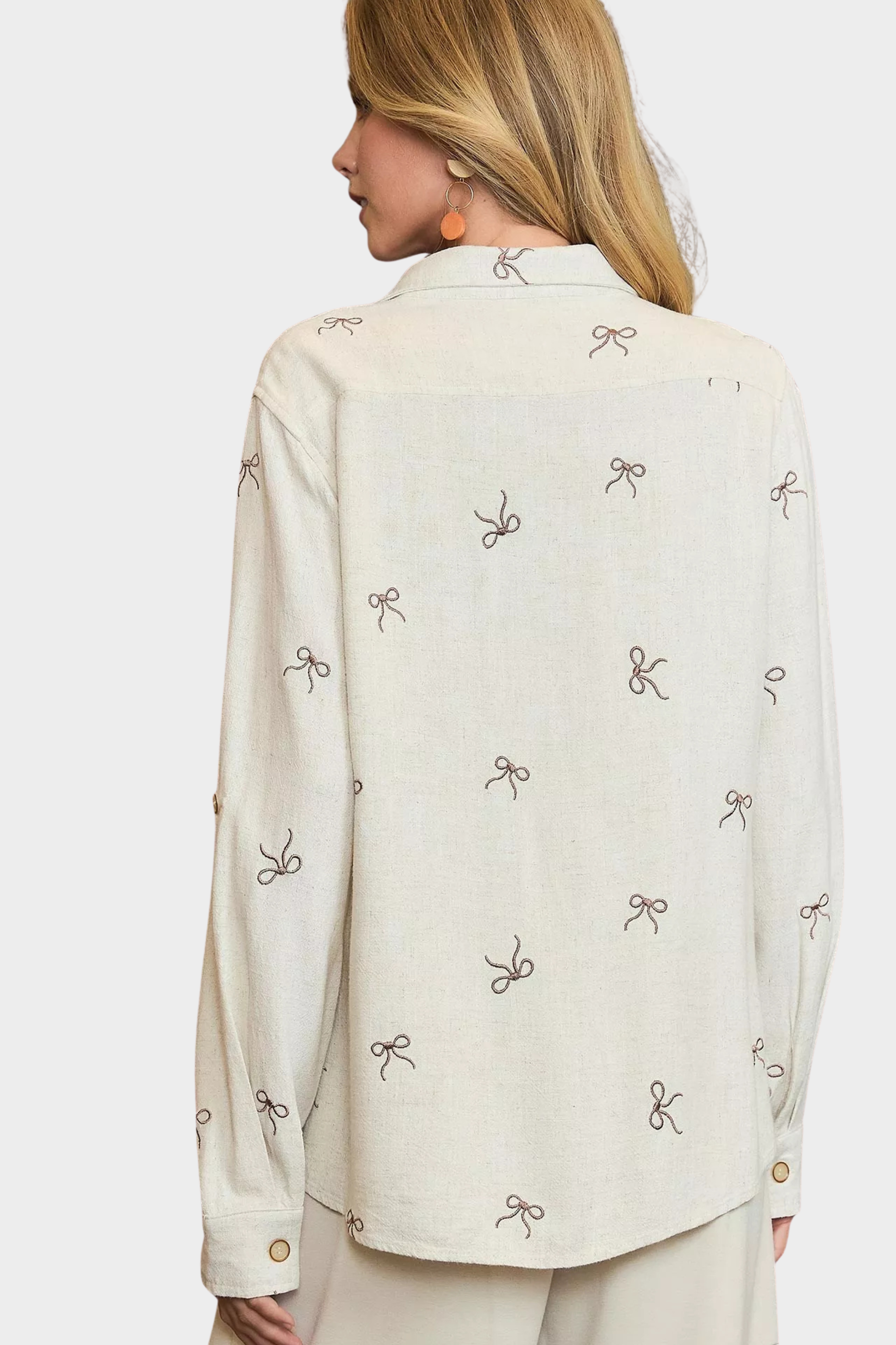Crafted from a linen blend fabric, this shirt offers a luxurious feel and a flattering fit. The trendy ribbon embroidery details add a touch of texture and visual interest to the classic design, elevating it to a statement piece. Whether worn casually with jeans or dressed up with trousers or a skirt, this shirt is versatile and suitable for a variety of occasions. The delicate embroidery enhances the overall look of the shirt, making it a standout addition to your wardrobe.