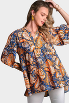The Paisley Boho Tunic Blouse is a stylish and versatile piece that can be dressed up or down for any occasion. Featuring a beautiful paisley print and a flowy tunic silhouette, this blouse is perfect for adding a bohemian touch to your wardrobe. The lightweight fabric makes it comfortable to wear all day long, while the loose fit provides a flattering and effortless look. Pair it with jeans for a casual day out, or dress it up with heels and statement jewelry for a night out. With its unique design and vibrant colors, this blouse is sure to be a favorite in your collection.