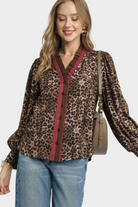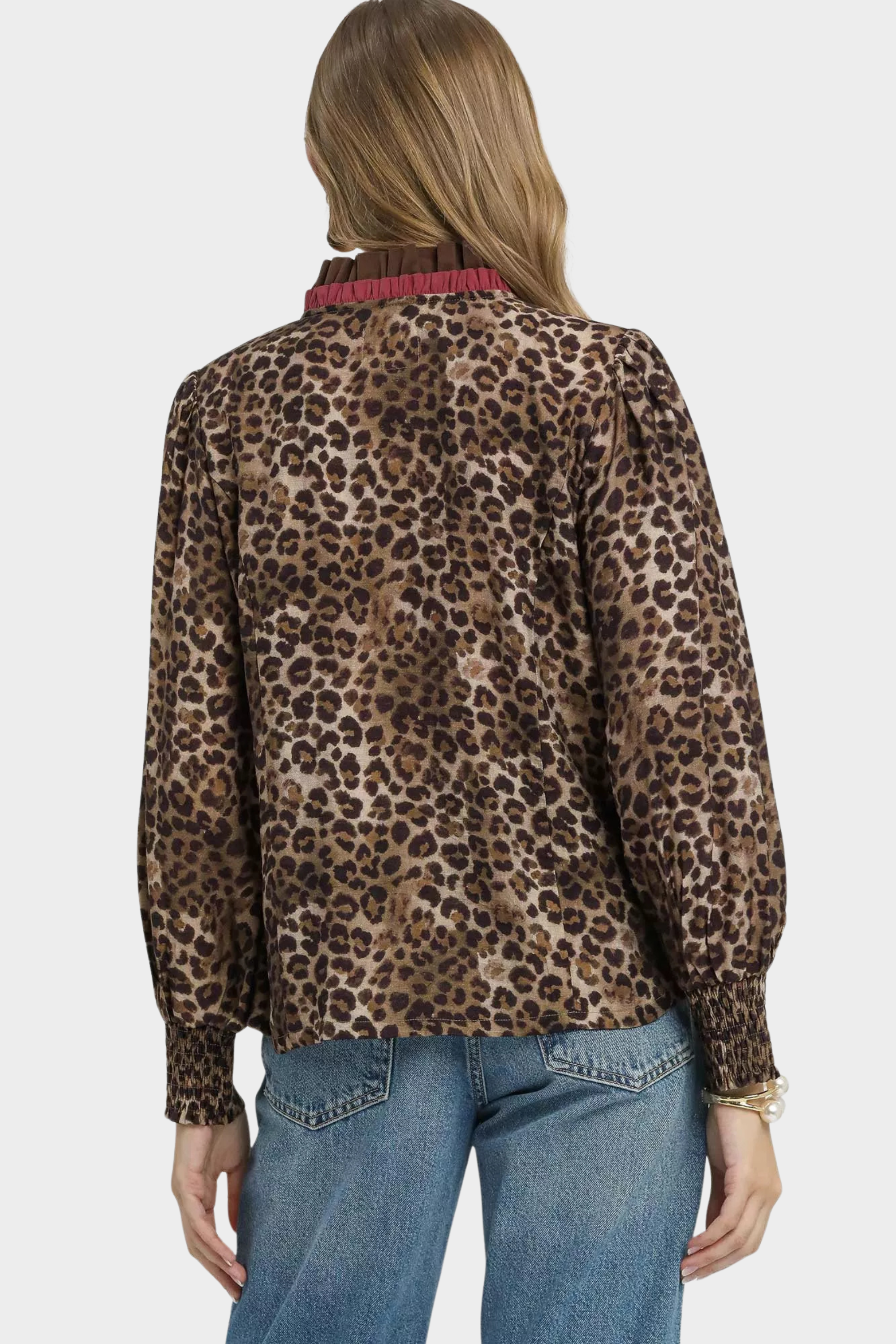The Ruffle Trim Leopard Print Shirt is a statement piece that combines playful ruffle details with a bold leopard print pattern. The ruffle trim adds a touch of femininity and texture to the classic animal print design, making it a versatile and stylish choice for any occasion. Pair this shirt with jeans for a casual yet chic outfit, or dress it up with tailored pants or a skirt for a more elevated look. The lightweight and airy fabric ensures comfort all day long, while the striking print makes a confident fashion statement. Stand out in style with this trendy and eye-catching leopard print shirt featuring feminine ruffle accents.