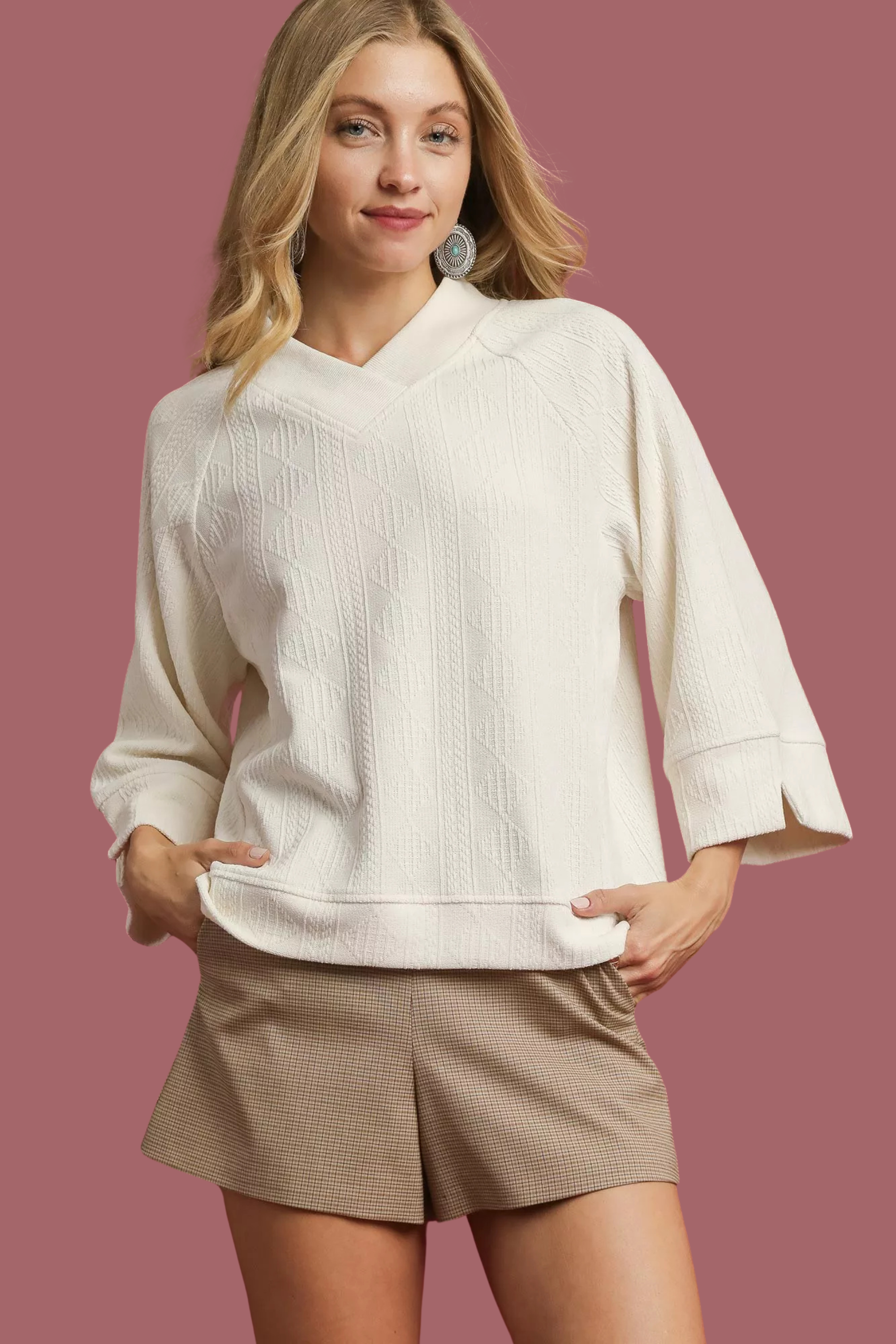 This elegant cream-colored cable-knit pullover features a flattering V-neckline and relaxed dropped shoulder design. Crafted from soft, comfortable knit material with distinctive cable-knit detailing across the front, this versatile sweater offers both style and comfort. The three-quarter sleeves and ribbed finishing at the hem and cuffs provide a polished look, while the oversized fit makes it perfect for casual everyday wear or layering. The neutral ivory tone pairs effortlessly with any wardrobe, making it an essential piece for modern casual styling.