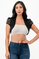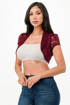 This crochet lace cropped shrug features an open front design and elegant cap sleeves, offering a lightweight layering option that enhances any outfit with delicate texture and refined style. Perfect for adding a touch of sophistication while maintaining comfort and breathability.