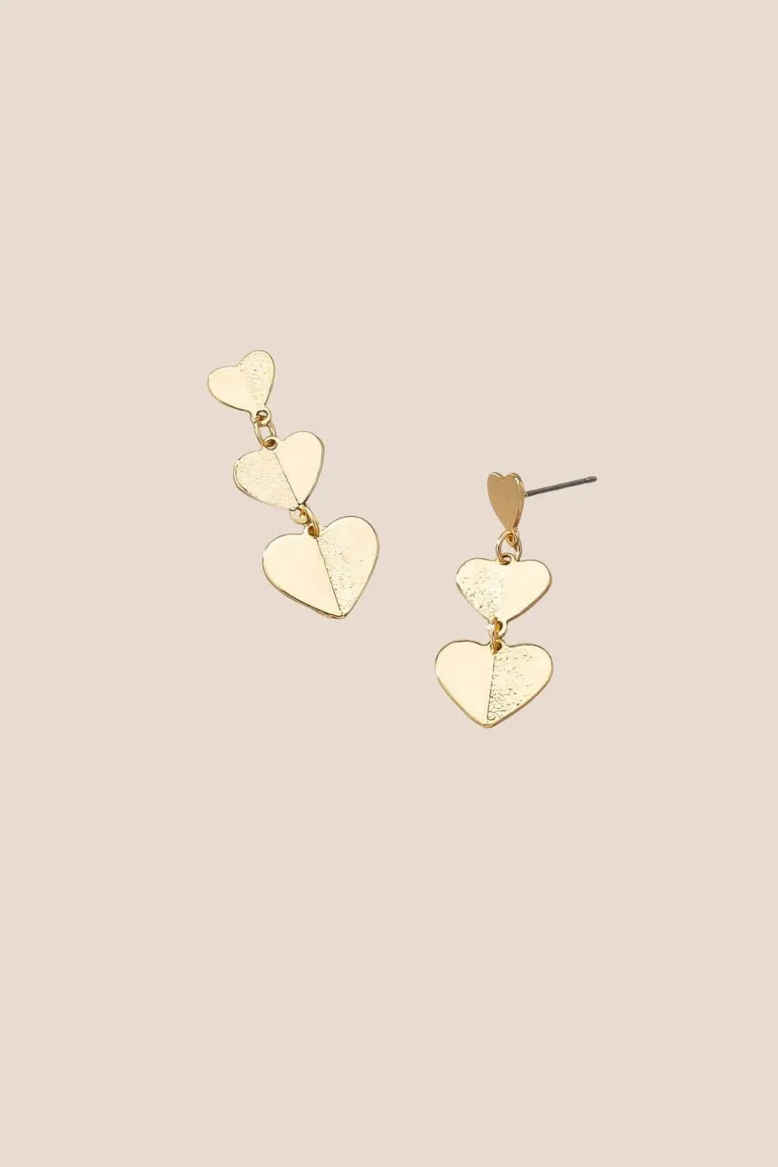 Gorgeous three graduate size heart linear drop earrings. Half of the heart is textured and half is polished. Finished in a shiny gold plating.