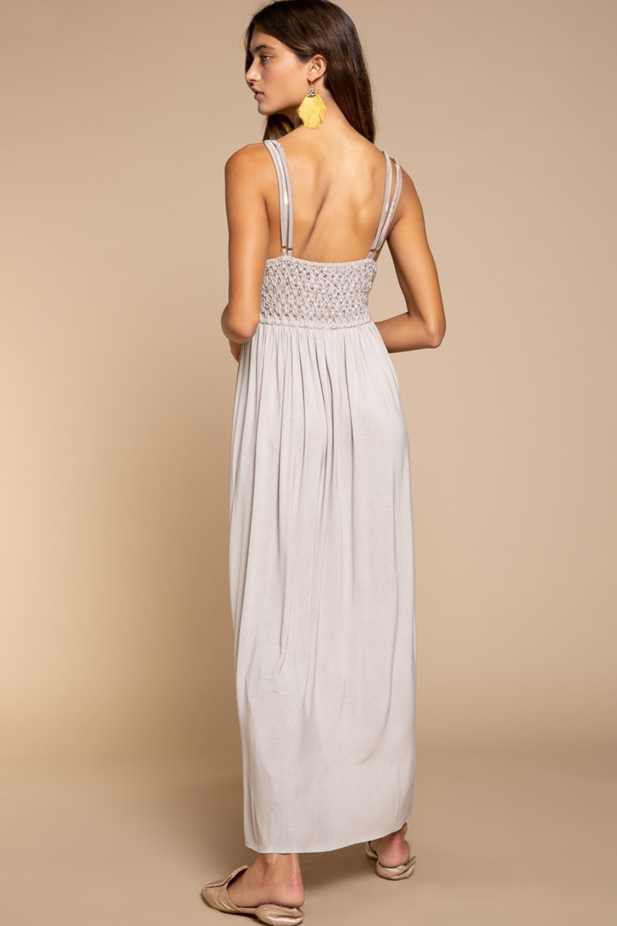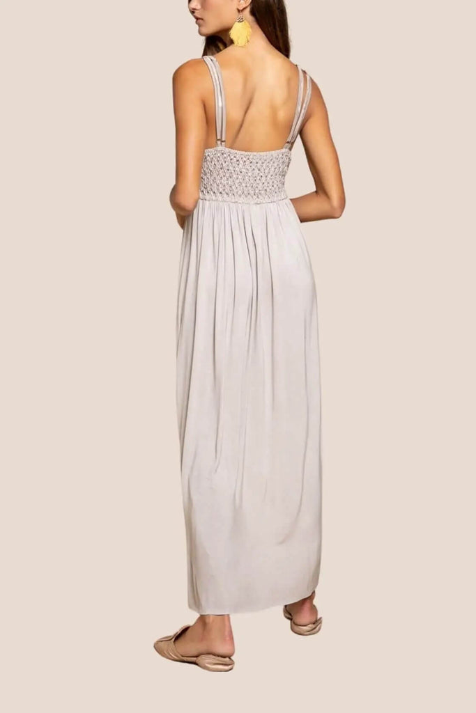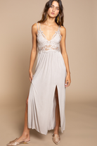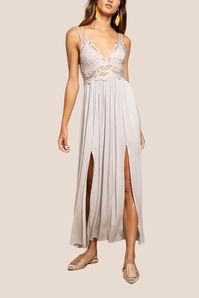 This sleeveless dress from POL Clothing features a flattering lace top, adjustable spaghetti straps, and smocked details on the back. The see through lace details on the front add a touch of elegance, while the two slits on the front offer a stylish twist. Perfect for any occasion, this dress will make you look and feel beautiful.
