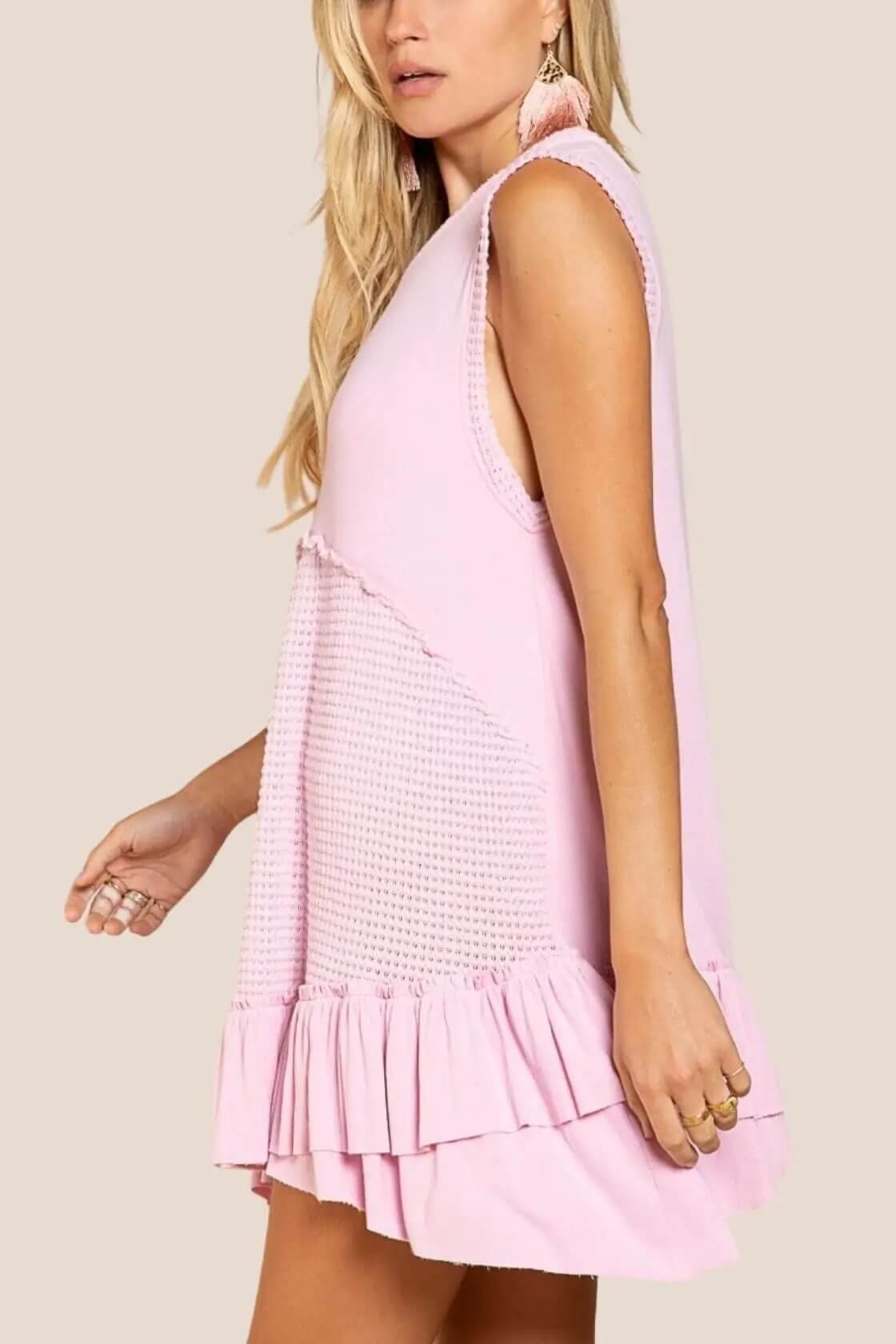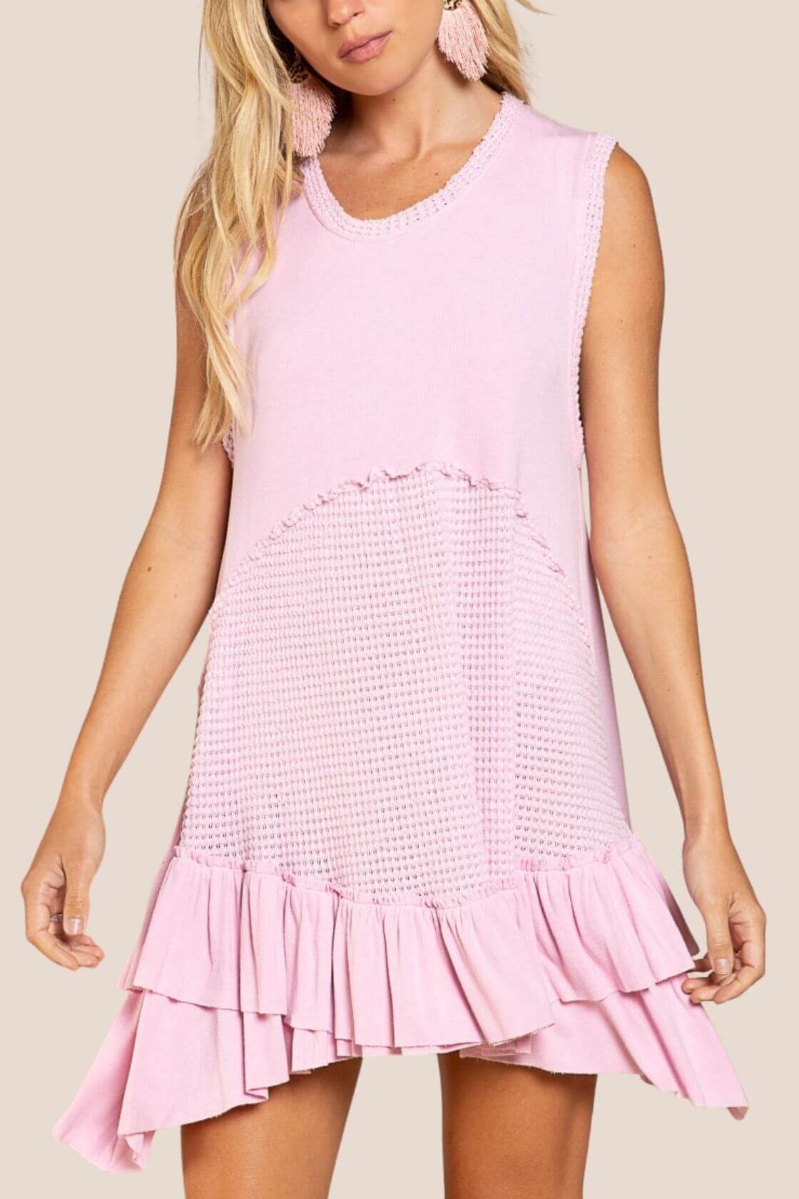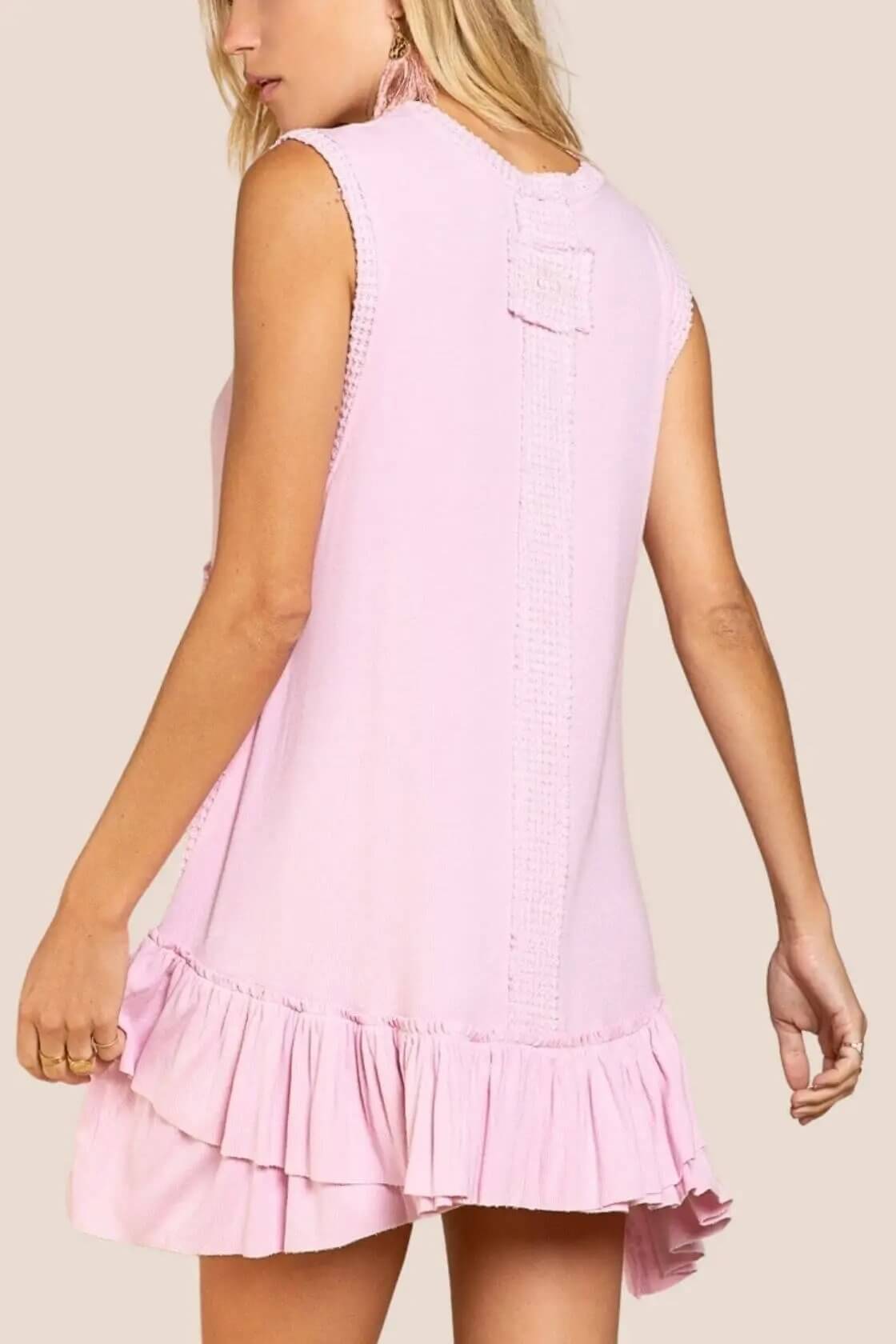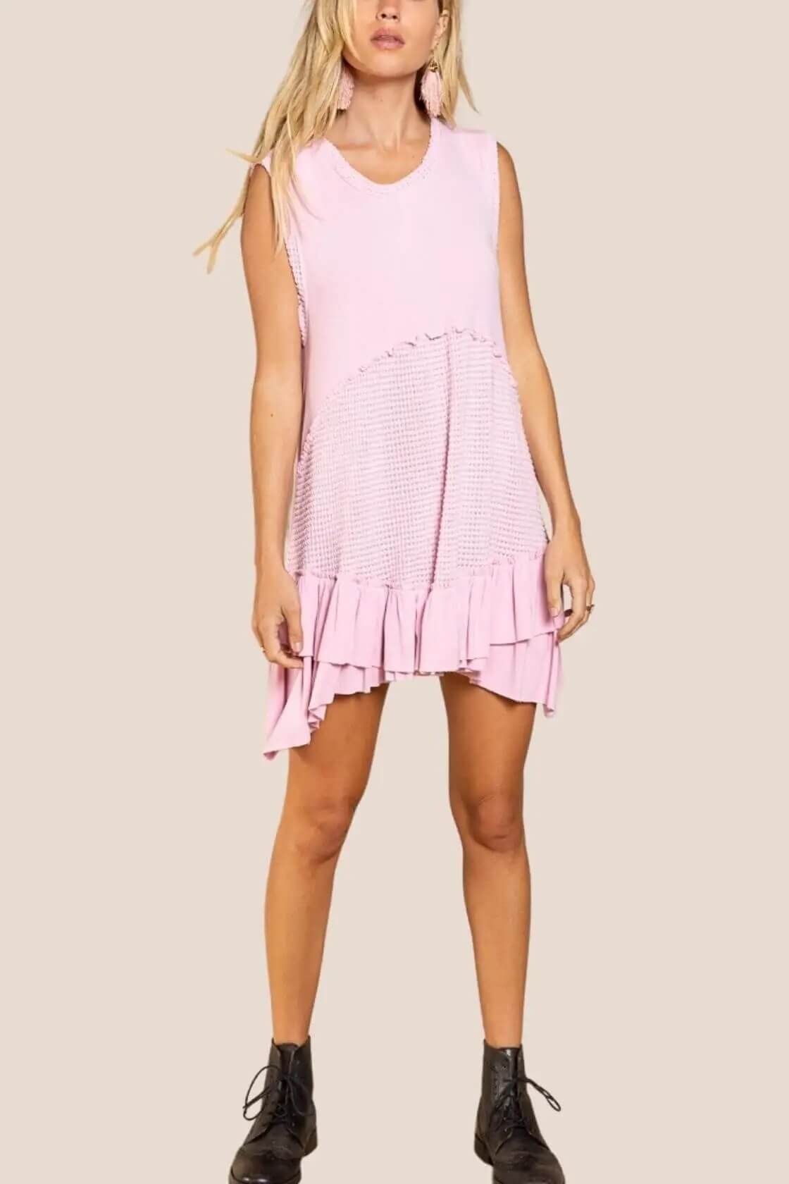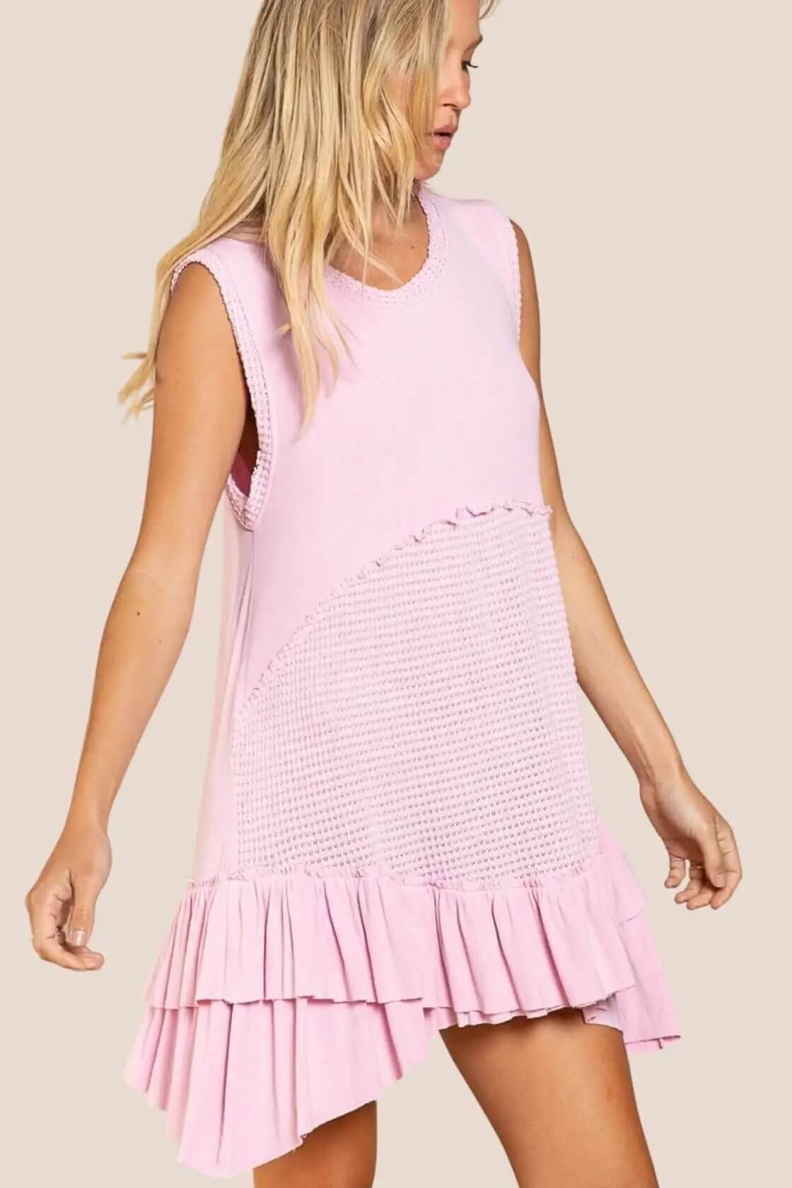 Upgrade your wardrobe with this Sleeveless Baby Doll Dress from POL. Designed with a round neckline and a ruffle hemmed thermal contrast band, it also includes a panel with raw edge for added style and comfort. Perfect for any occasion, elevate your look with ease.
