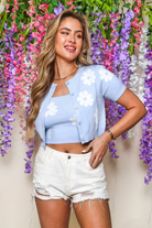 Cropped light blue daisy printed cardigan with buttoned down closure. Round neck and short sleeves. Pair this cute sweater with jeans or your favorite denim shorts.