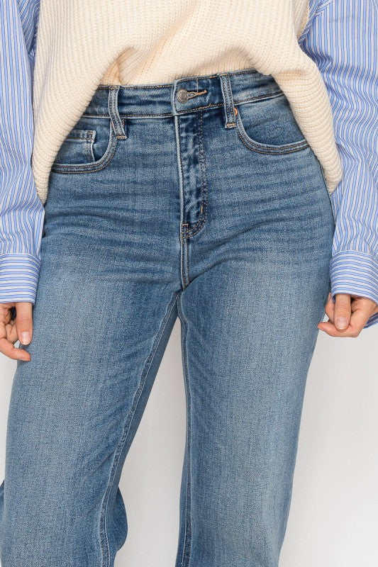 Experience the ultimate in comfort and style with our High Rise Straight Leg Jeans. Crafted from an eco-friendly blend featuring less cotton and more lyocell, these jeans offer a soft, smooth texture you'll notice at first touch. The high-rise waist and straight silhouette create a flattering, modern fit, while the ankle length and raw hem add a casual edge. Plus, the super stretchy denim ensures all-day comfort without sacrificing style. Ideal for those who value sustainability and expert craftsmanship in their wardrobe.