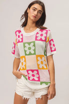 This vibrant lightweight sweater features a multi-colored floral block pattern that combines pink, green, orange, and white tones in a geometric design. Crafted from soft lightweight knit fabric, it offers comfortable breathability perfect for transitional seasons. The short sleeve design and relaxed fit make it ideal for casual everyday wear, while the bold floral motifs add a playful feminine touch. The round neckline and modern color blocking create a contemporary look that pairs effortlessly with various bottoms for versatile styling options.