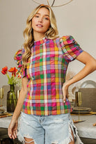 This multi-color plaid blouse features a vibrant rainbow checkered pattern that makes a bold fashion statement. Crafted from comfortable polyester fabric, it offers ease of movement. The short puff sleeves add a feminine touch while the round neckline provides classic appeal. Perfect for casual outings, weekend gatherings, or adding a pop of color to your wardrobe. The bright plaid design combines multiple hues including pink, green, yellow, and blue, making it easy to pair with denim or solid-colored bottoms. Machine washable for convenient care, this blouse is ideal for fashion-forward women who love vibrant, playful styles.