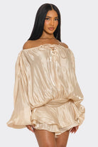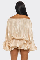 Command attention in this show-stopping champagne metallic romper. The dramatic off-the-shoulder cut, complete with a sultry lace-up front, instantly elevates your look. Voluminous statement sleeves contrast beautifully with the playful ruffled shorts, all crafted in a liquid-metal fabric that catches the light with every move. Define your waist and dance the night away in this unforgettable piece.