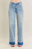 These contemporary wide-leg jeans feature a flattering high-rise silhouette crafted from premium stretch denim. The light wash finish offers versatile styling options while the distinctive released hem adds modern edge. The relaxed fit through hip and thigh creates a comfortable wearing experience. Made with quality denim fabric that provides excellent shape retention and durability. The contrast hem detail and raw edge finish create visual interest. Perfect for casual everyday wear with a fashion-forward twist.