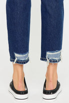 Update your denim collection with these high rise mom fit jeans. The distressed detailing adds a touch of edge and personality to the classic mom jean style. The high rise design provides a flattering and comfortable fit that cinches at the waist. Pair them with a cropped top and sneakers for a casual-cool look, or dress them up with a blouse and heels for a trendy and chic outfit.