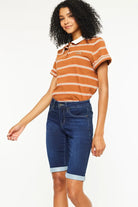 With a flattering mid-rise waist and a Bermuda length, these shorts offer a timeless and versatile silhouette. Perfect for both casual and semi dressed-up looks, these shorts can be paired with a variety of tops and shoes. Stay cool and comfortable while looking effortlessly chic in these denim shorts that are perfect for sunny days and warm weather outings.