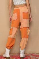 These stylish patchwork cargo pants feature a trendy color-blocked design combining vibrant orange panels with neutral tones. Made from comfortable lightweight cotton fabric, they offer a relaxed fit with practical cargo pockets and an adjustable drawstring waist. The tapered leg design with elastic cuffs creates a modern streetwear silhouette perfect for casual everyday wear. The eye-catching patchwork construction and functional details make these pants a standout piece for fashion-forward individuals seeking both style and comfort.