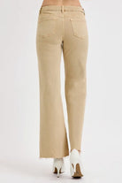 These stylish high-waisted wide leg jeans feature a premium stretch denim blend in a versatile khaki beige tone. The flattering high-rise waistline accentuates your curves while the wide leg silhouette creates an effortlessly chic retro-inspired look. Crafted with classic five-pocket styling and secure button-zip closure, these jeans offer both style and functionality. The raw frayed hem adds a contemporary edge, while the cropped length pairs perfectly with heels or sneakers. Made from comfortable stretch denim that moves with you throughout the day, these jeans are perfect for casual outings, work, or weekend adventures.