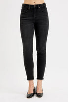 These high-waisted black skinny jeans feature a sleek and modern design perfect for contemporary fashion lovers. Crafted from premium stretch denim material that provides comfort and durability while maintaining the perfect fit. The high-rise waistline creates a flattering silhouette that elongates the legs and accentuates the waist. The classic black wash offers versatility for both casual and dressed-up occasions. The raw hem detailing adds a fashion, edgy touch to the overall design. Features traditional five-pocket styling with secure button and zipper closure. The ankle-length cut pairs perfectly with heels or boots, making these jeans a wardrobe essential for the fashion-forward individual.