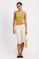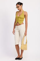 These Tailored Mid Rise Bermuda Pants feature a refined front button detail that adds a polished touch to their structured design. Equipped with practical back pockets, they combine style with functionality, making them an ideal choice for a sophisticated yet comfortable look. Perfect for elevating your warm-weather wardrobe with expert tailoring and thoughtful details.